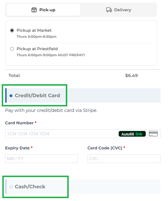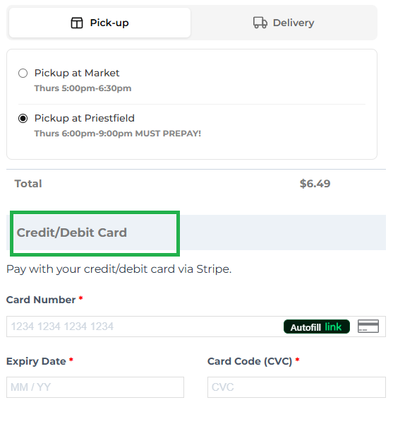 Prepayment via Card is Required for Delivery and Drop Off Points (Priest Field Pickup).