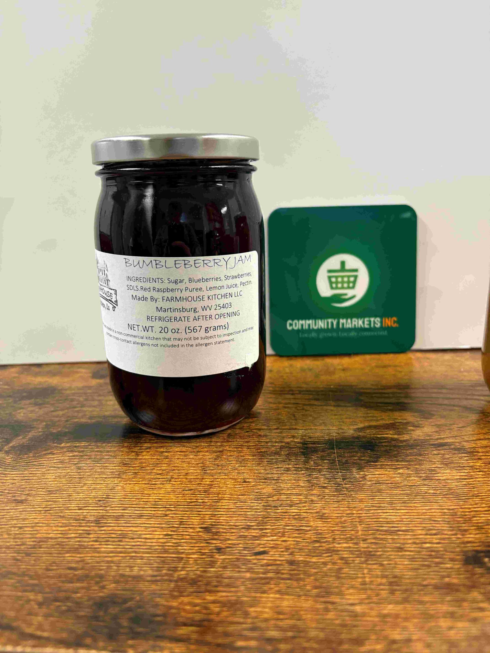 Jam comes in 10 oz. and 20 oz. jars. Product of Farmhouse Kitchen.