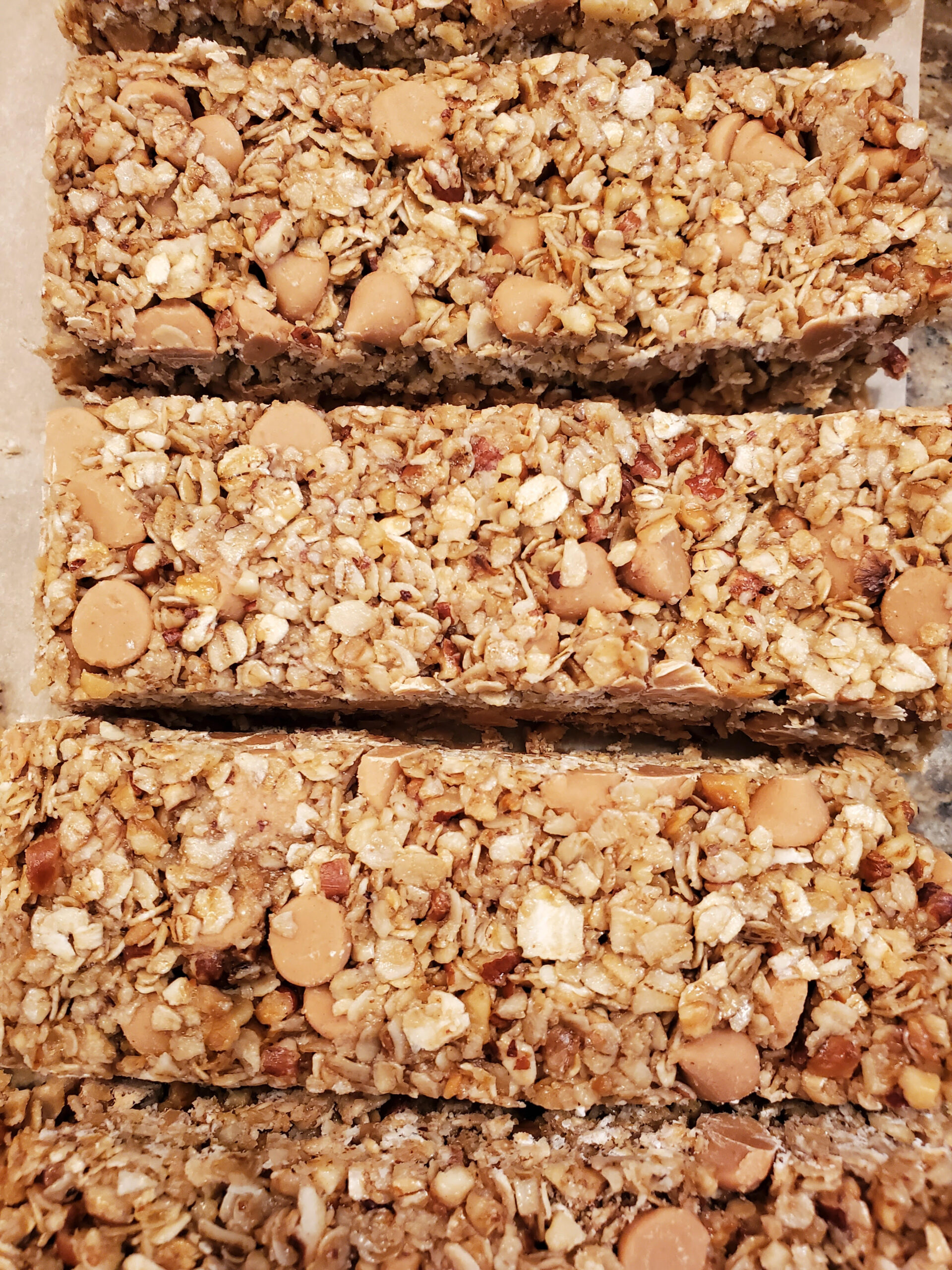A chewy granola bar containing oats, pecans, and walnuts that have been combined with either chocolate chips or peanut butter chips. WARNING! OUR GRANOLA BARS DO CONTAIN NUTS! Please choose your style of choice or the decision will be left to the whimsy of our bakers!